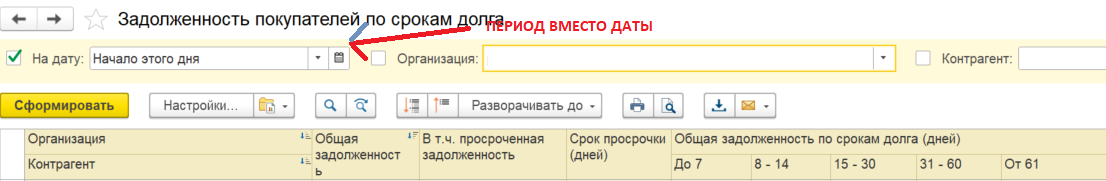 Дебиторская задолженность по срокам долга (УНФ) с отбором по периоду.
