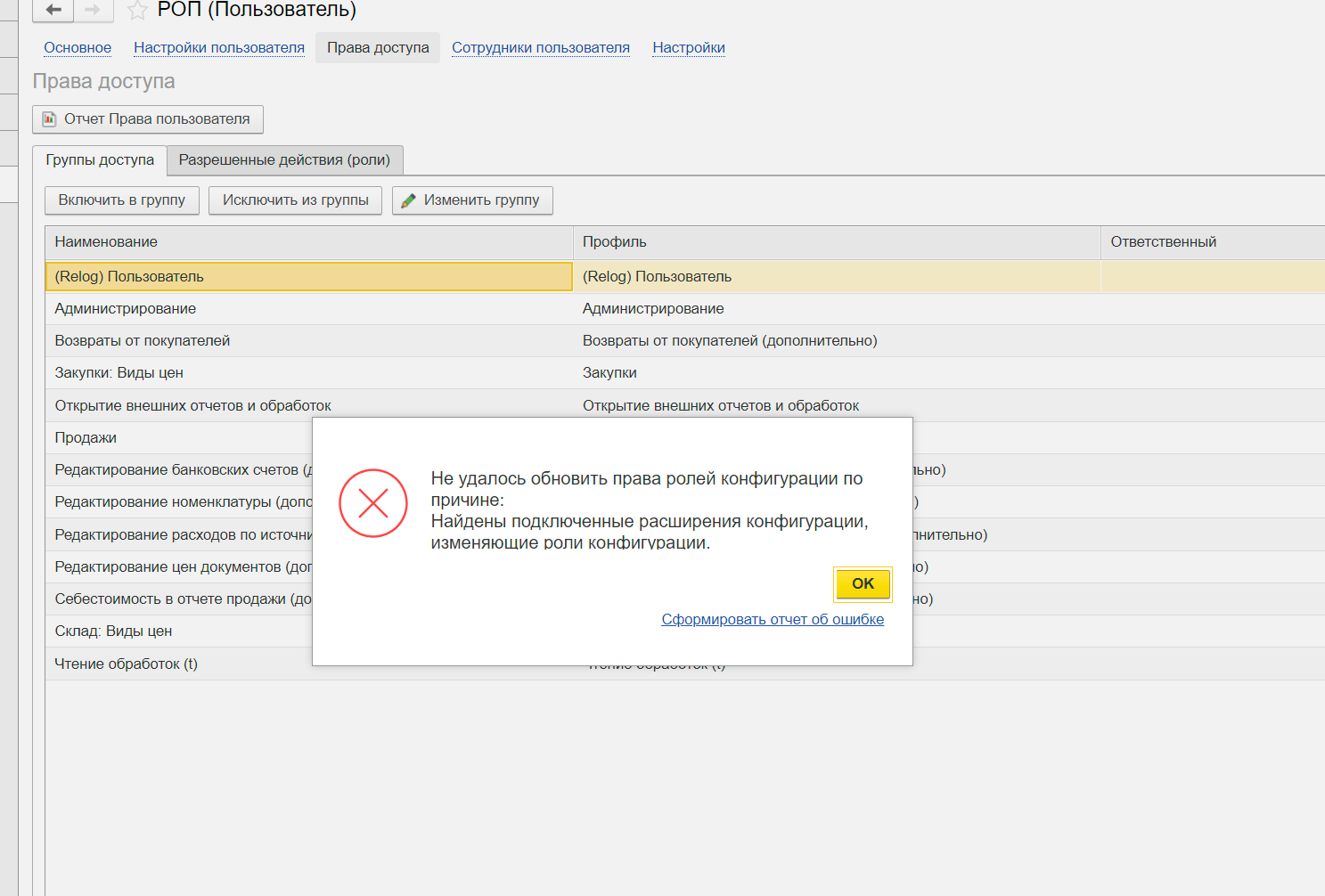 Не удалось обновить права ролей конфигурации по причине: Найдены подключенные расширения конфигурации, изменяющие роли конфигурации. См скрин.