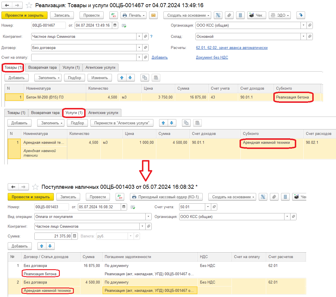 В документе "Реализация товаров" указываются товары и услуги (в табличных частях) с указанием субконто, нужно что бы при вводе на основании документа "Поступление наличных" создавались записи в табличной части - разбивка платежа (свернутые по таблицам и субконту).