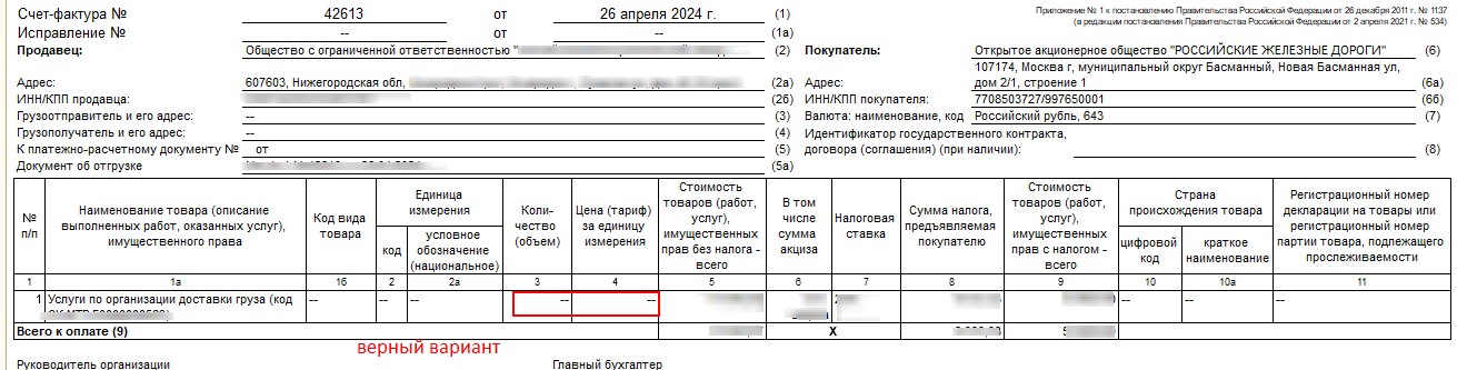 По их требованиям: у транспортных услуг, которые идут на выгрузку, не должно отображаться количество и цена за тариф.