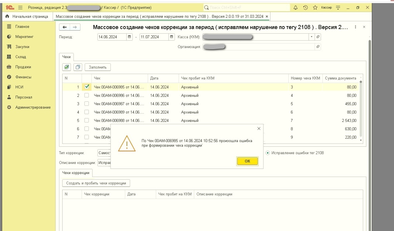 На рознице 2.3 обработка возвращает ошибку при формировании чека коррекции, см. скрин.