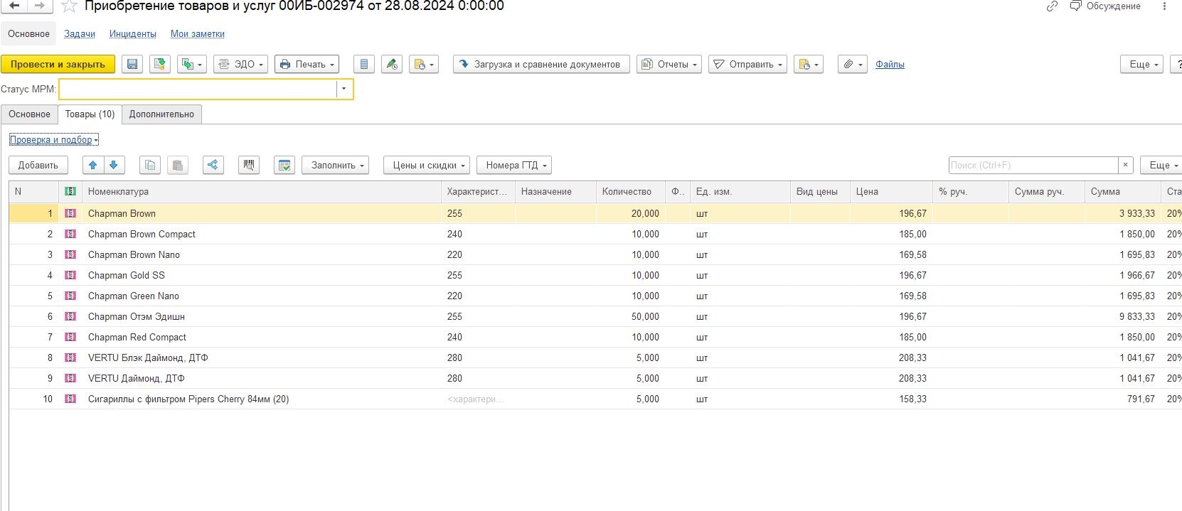 Товары с ценами без характеристик должны отражаться по ценам закупки