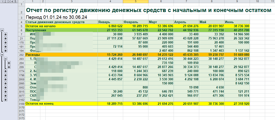 в отчете требуется показать обороты по месяцам по статьям ДДС в иерархии. и каждому месяцу добавить начальный и конечный остаток денежных средств (взять из регистра ДенежныеСредства). В настройках отчета (на форме) должна быть возможность указать период отчета.