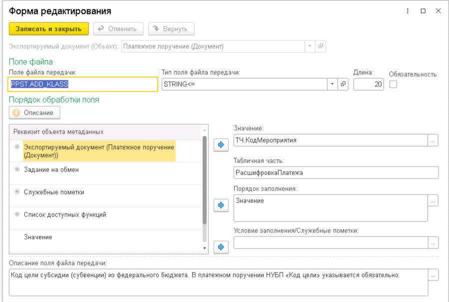 Требуется доработать формат "TXPP230101 Платежное поручение" обмена с казначейством таким образом, чтобы в поле "PPST.ADD_KLASS" при выгрузке попадал код мероприятия из табличной части документа.