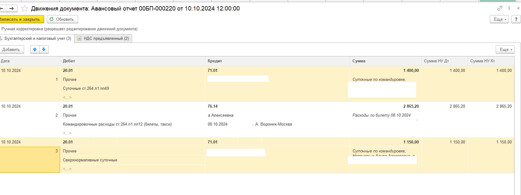 В 1С:Бухгалтерии 3 доработать проводки документа "Авансовый отчет" по суточным