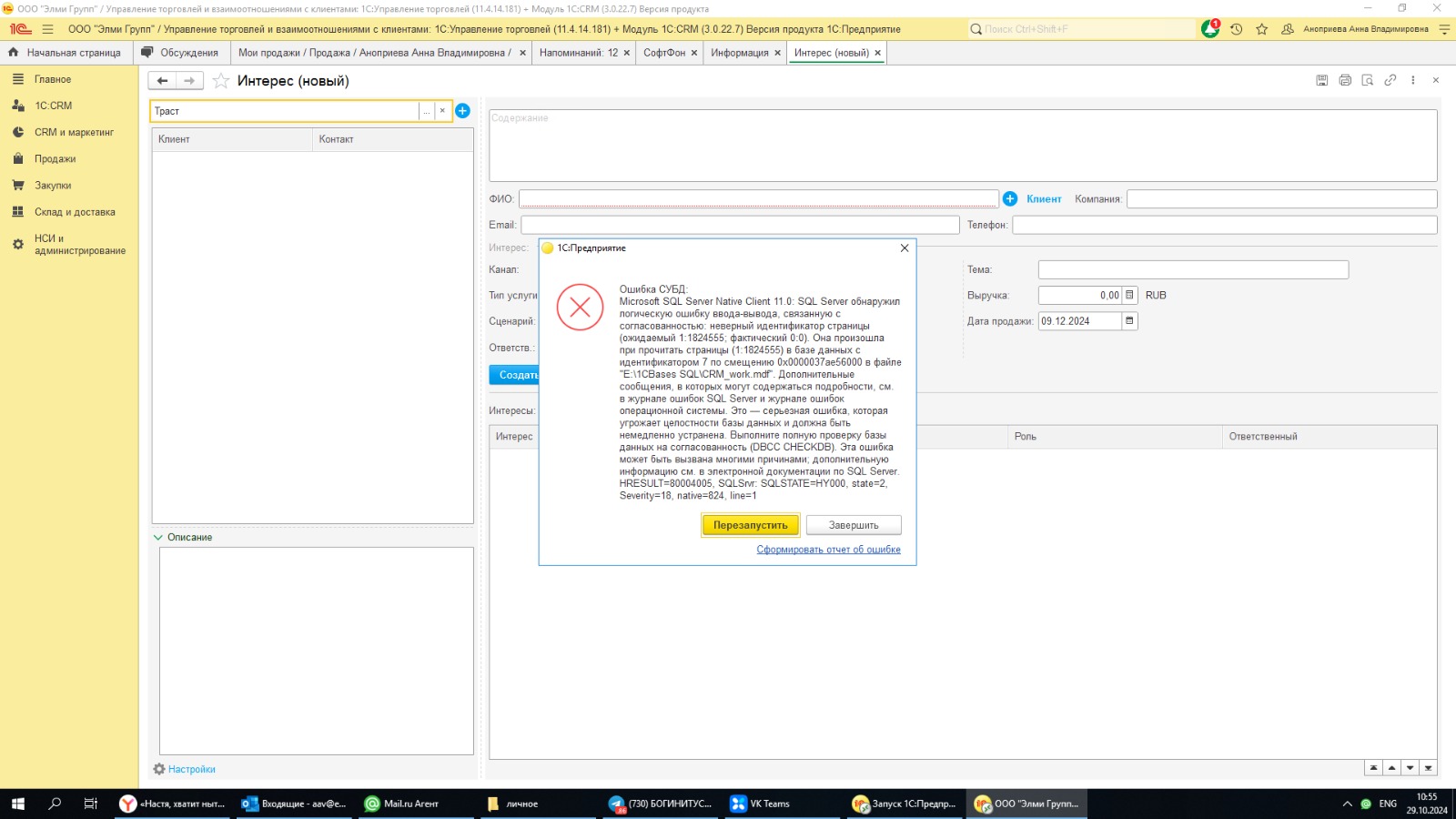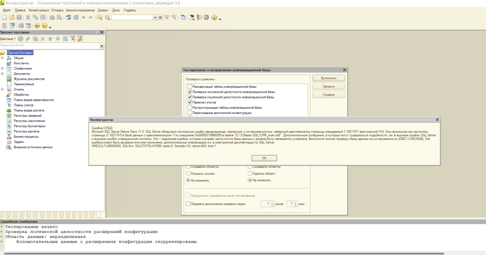 появляется ошибка СУБД Microsoft SQL Server Native Client 11.0/ Server обнаружил логическую проблему ввода-вывода, связанную с согласованностью...