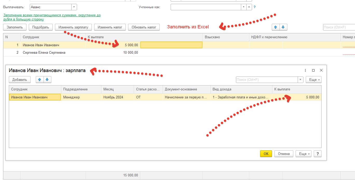 Заполнение выплат сотрудникам в документе "Ведомость в банк" из файла Excel