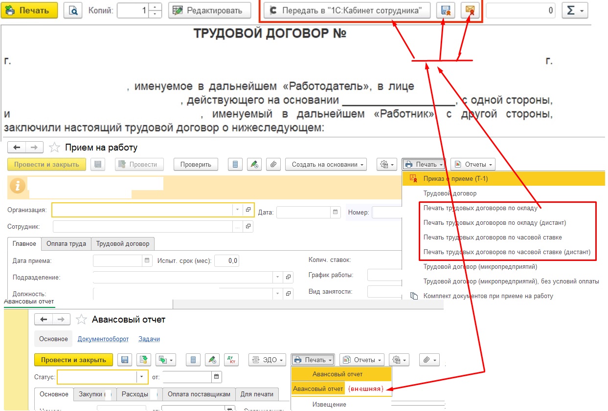 1. Доработать 4 внешние печатные формы, для совместимости "1С:Кабинет сотрудника", с поддержкой команд: