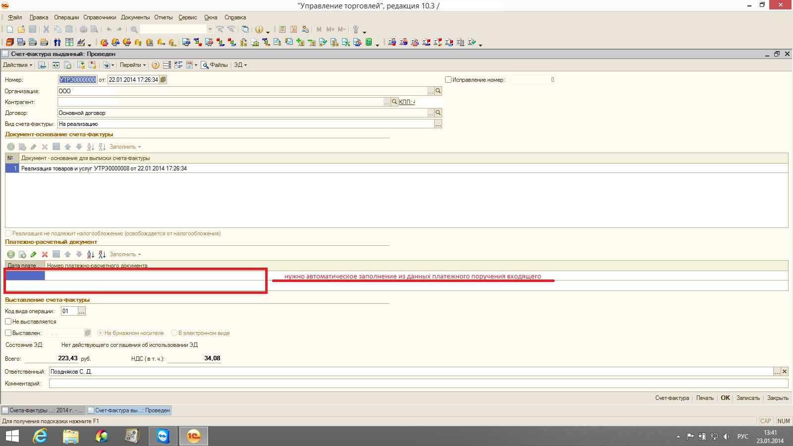 в С-ф выданный введенную на основании Реализации не заполняется номер и дата платежного поручения!