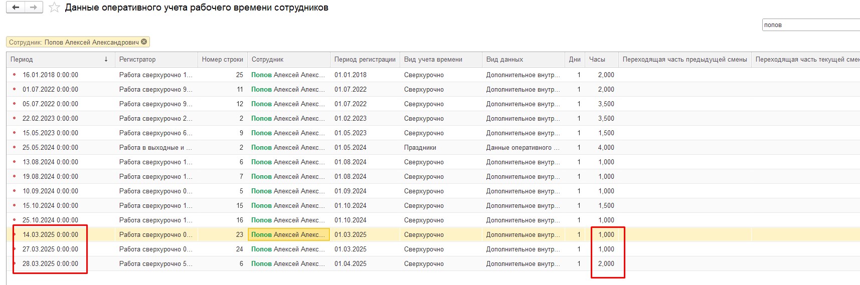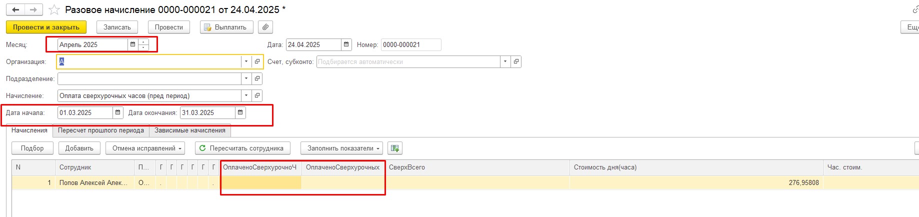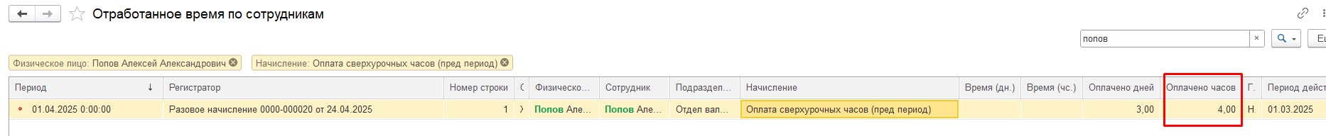При проведении Разового начисления в регистр Отработанное время записывается все количество часов за март по виду времени, указанному в виде начисления "Расчет сверхурочных за предыдущий период", т.е. в нашем случае, все часы Сверхурочно, не только те, которые мы хотим оплатить этим разовым начислением (скрин).