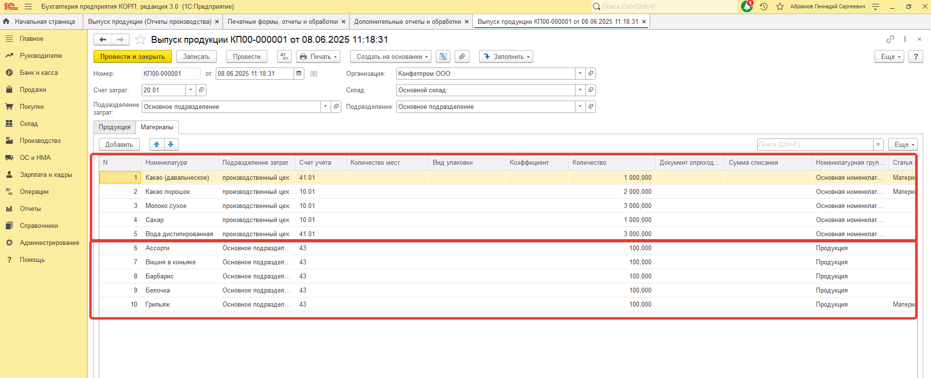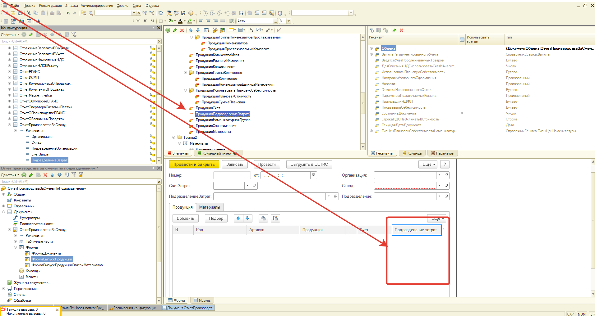 3. Если в табличных частях "ПРОДУКЦИЯ" и "МАТЕРИАЛЫ" подразделения не выбрано, то при записи подставляется подразделение затрат из шапки докумета https://disk.yandex.ru/i/WgU-UA_be4vCQA