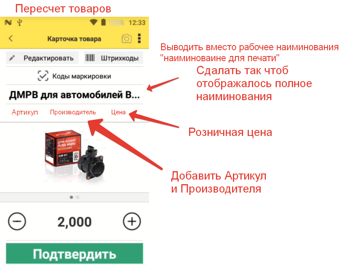 В 1С УТ требуется доработка мобильного места кладовщика а именно в карточку товара выводить артикул, производитель и цену.