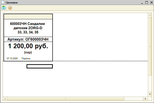 Добрый день, требуется доработать обработку печать ценников для 1С УТ10.3, что сейчас смотри изображение, табличная часть заполняется номенклатурой и характеристика на каждой строке, нужно чтобы характеристики (размеры) выводились на одну строку, через запятую, только имеющиеся в наличии и итоговая печатная форма выводила характеристики (размерный ряд).