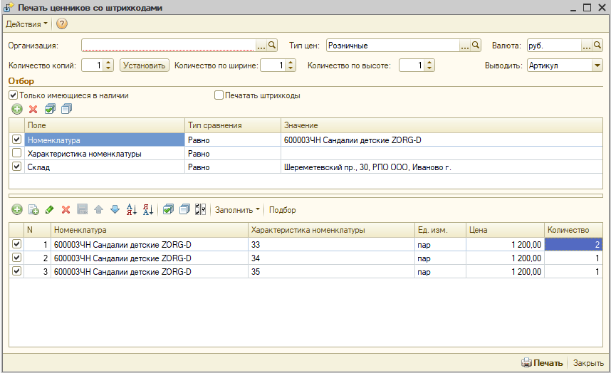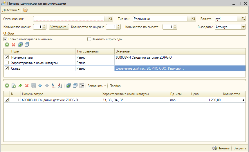 Добрый день, требуется доработать обработку печать ценников для 1С УТ10.3, что сейчас смотри изображение, табличная часть заполняется номенклатурой и характеристика на каждой строке, нужно чтобы характеристики (размеры) выводились на одну строку, через запятую, только имеющиеся в наличии и итоговая печатная форма выводила характеристики (размерный ряд).