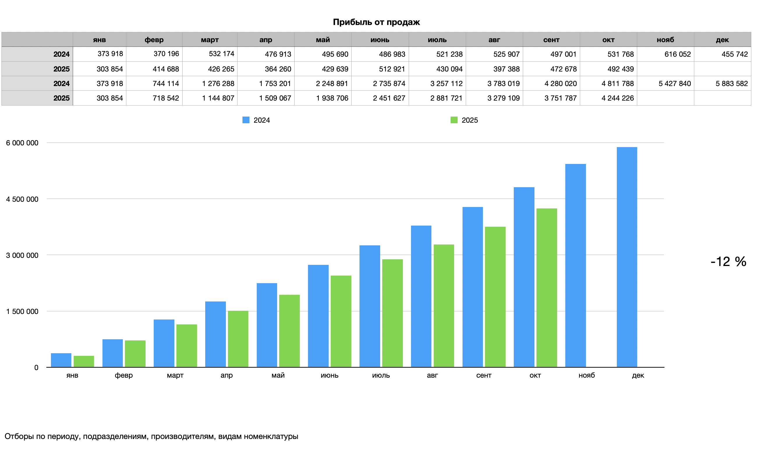 Сделать отчёт для типовой ERP 2.5.22.109 (8.3.27.1719) сравнение прибыли от продаж двух периодов с отборами по подразделениям, производителям и видам номенклатуры. Прибыль указывается нарастающим итогом. Выводить данные в виде таблицы и графика.