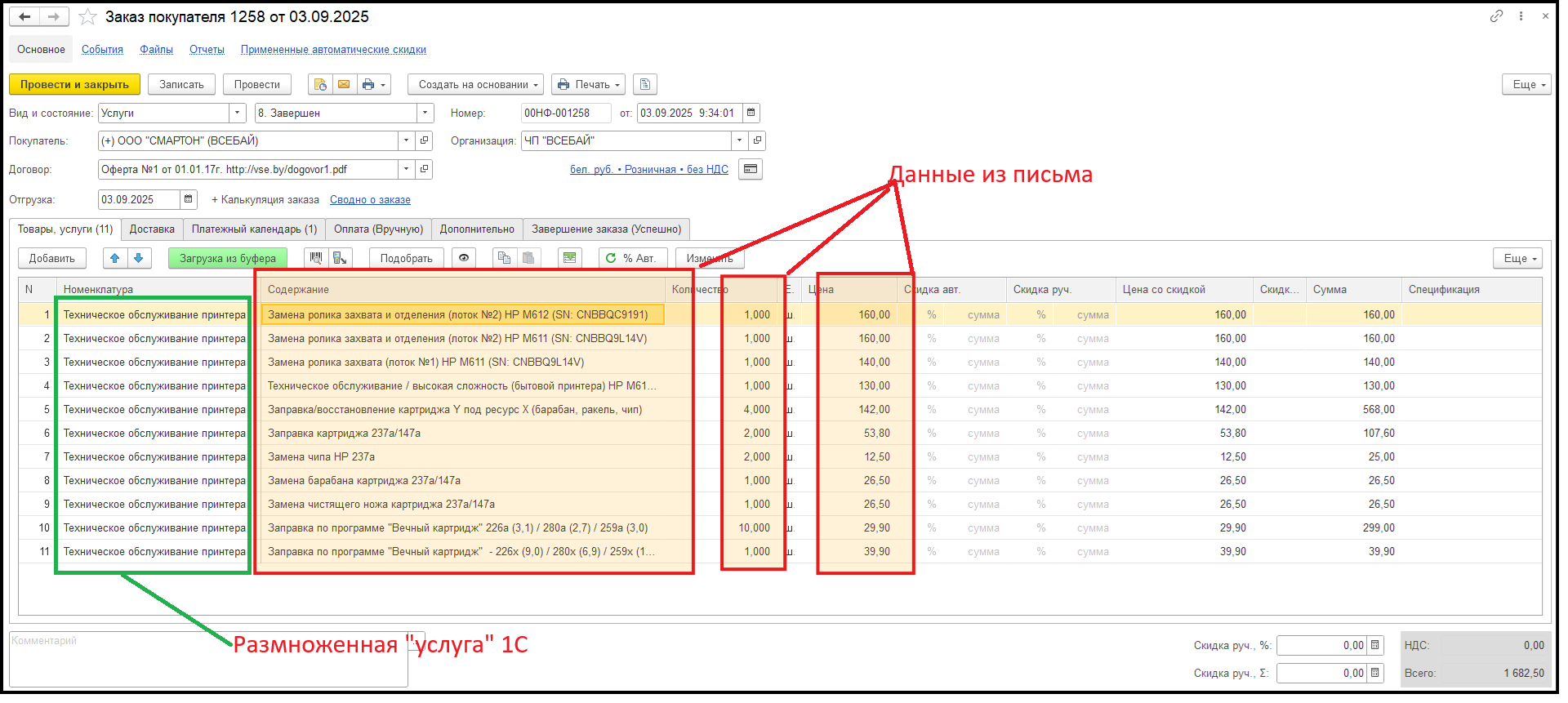 Парсинг HTML псьма с переносом услуг в Заказ покупателя