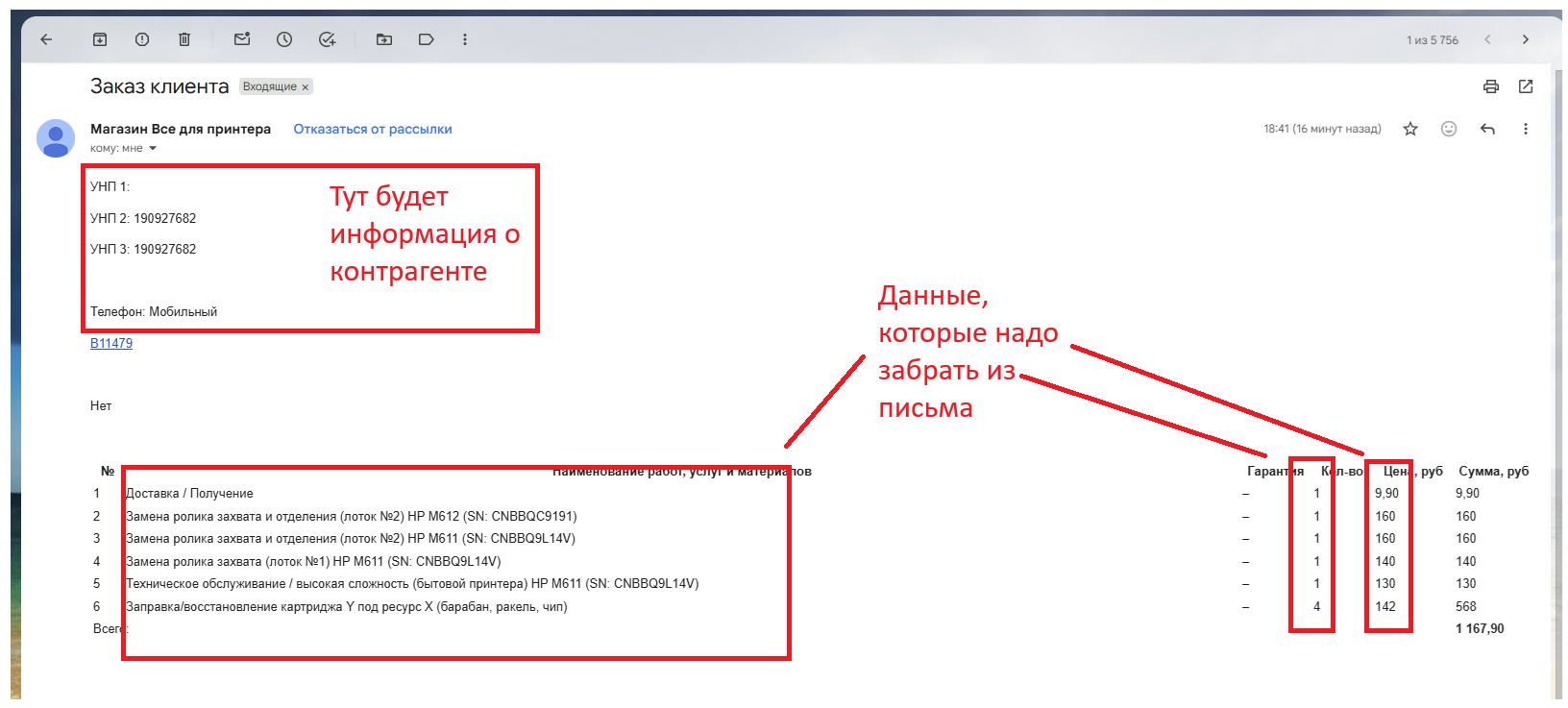 Необходимо разобрать входящие письма в почте и по содержанию формировать "Заказ покупателя" с аналогичным списком услуг и контрагентом. Данные находятся в теле самого письма и будут стандартизированы. Услуги находятся в табличной части (наименование, кол-во, цена). Контрагент будет содержать УНП, телефон, адрес и наименование. Надо предусмотреть создание нового контрагента, если совпадение найдено не будет. Сопоставлять услуги в письме с номенклатурой в 1С не надо - каждая услуга будет переноситься в поле "Наименование для печати" в одной выбранной единице номенклатуры, которая будет размножена по числу услуг в письме. Понятнее это будет видно на скриншоте.
