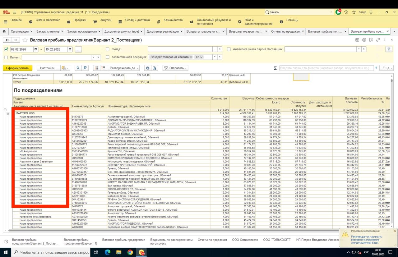 В отчетах по типу "Валовая прибыль" Показывается в качестве поставщика "Наше предприятие" а где то реальный поставщик. Там где мы купили например на орг 1 и продали с орг 1 показывается реальный поставщик, но там где мы купили на орг 1 а продали с орг 2 показывается в качестве поставщика "Наше предприятие" .