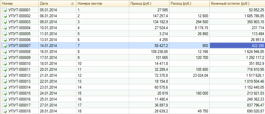 3. После обновления с 11.1.4.10 до 11.1.4.13 в кассовой книге не правильно отображается конечный остаток, хотя по документам (лист кассовой книги) все хорошо.