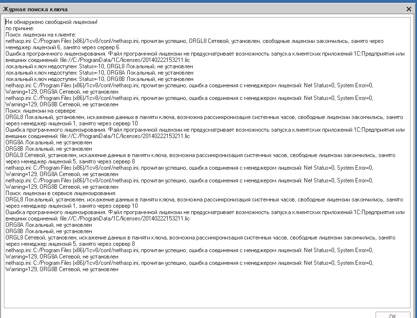 2) Не найдено свободной лицензии. Если ключ на 10 лицензий, то при занятых 5 уже может не пускать в 1С.