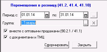 Отчет собирает перемещенный товар в розницу (счет 41,12 для 8ки) и + (опционально) опт продаж.
