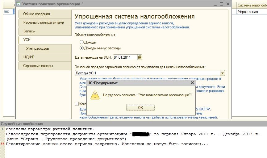 Сейчас при попытке сменить тип НО через меню Предприятие - Учетная политика - Учетная политика организаций выдается ошибка "не удалось записать Учетная политика организаций".