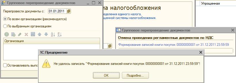 Не удалось записать "Формирование записей книги покупок 00000000001 от 31.12.2011 23:59:59"!"