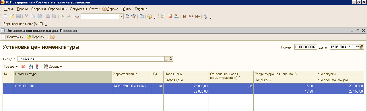 Форма документа «Установка цен номенклатуры» в Рознице 1.0 для пользователя была очень удобна (со всеми полями и колонками, которые в ней есть).