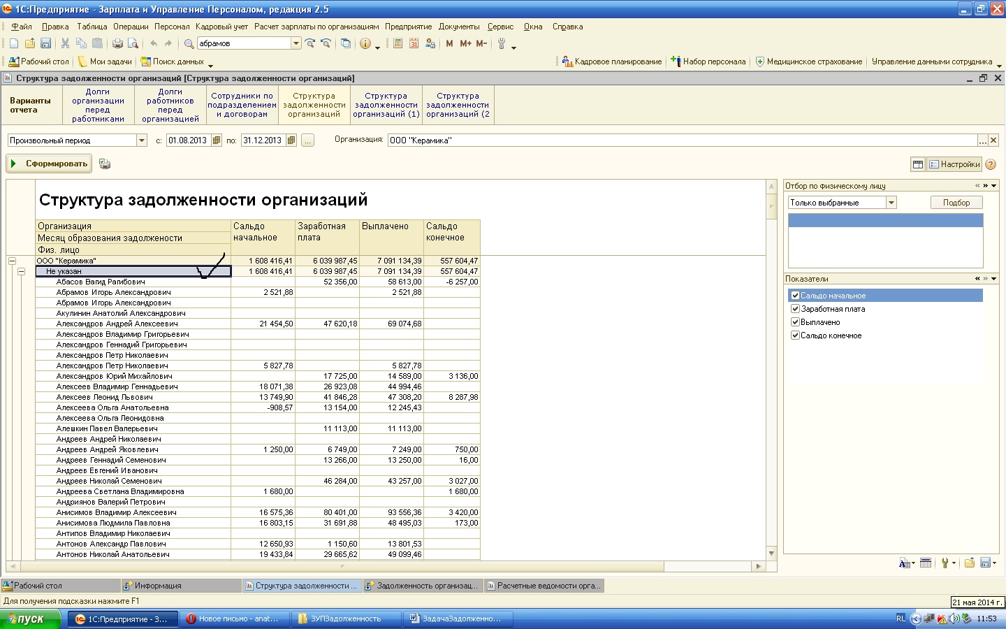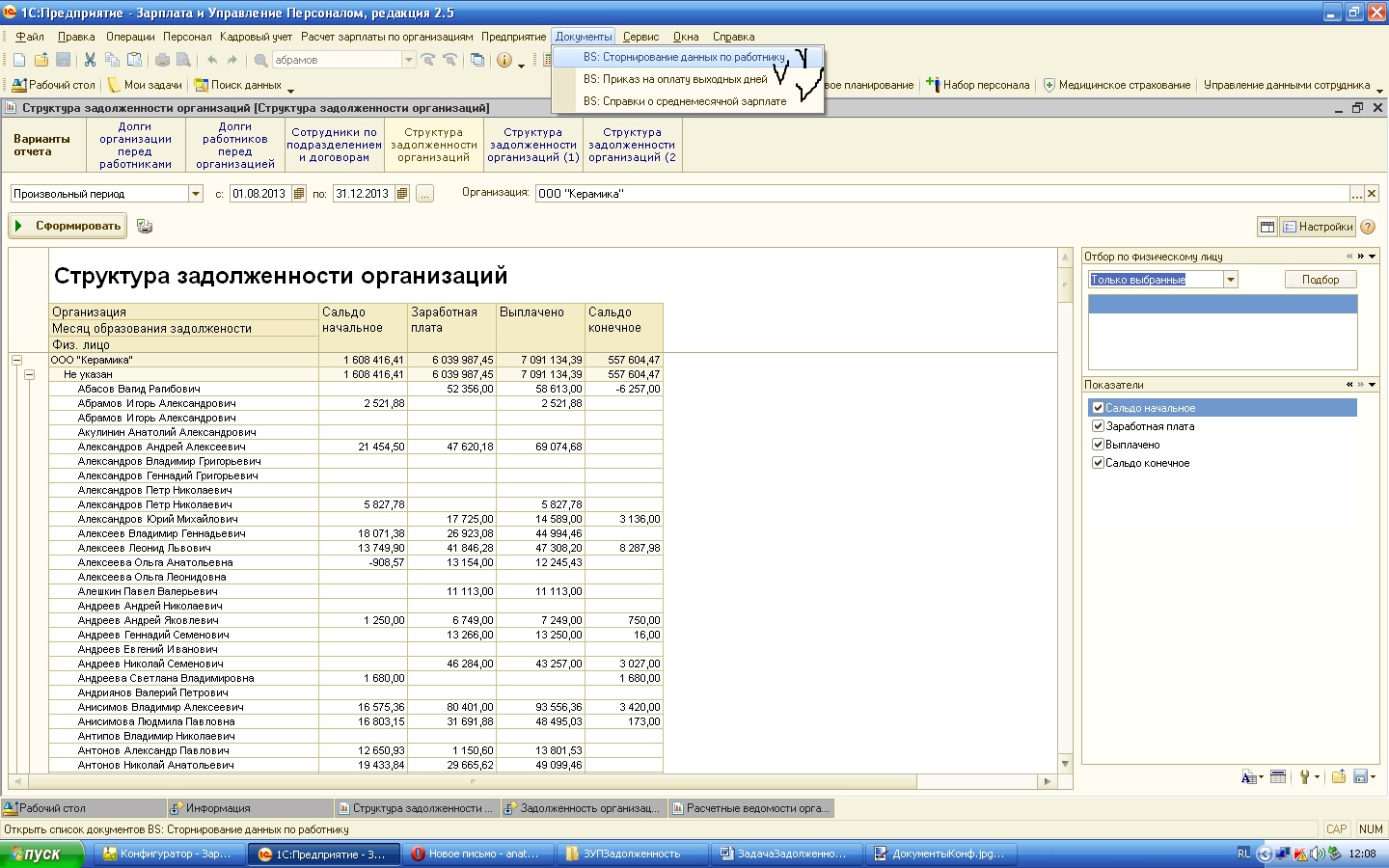 Задача состоит в следующем, при формировании отчета «Структура задолженности организаций» в ЗУПе, не заполняется строчка «Месяц образования задолженности» см. скринСтрЗадолж1.jpg , я понял в конфе. можно сделать так, чтобы эта строчка выходила. В общем, в этом отчете, или в новом отчете нужно, чтобы заполнялась строчка «Месяц образования задолженности», и нужно добавить группировку по подразделениям.