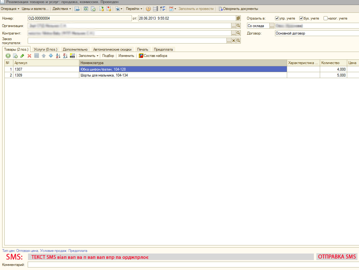 1. из накладной (Реализация товаров и услуг) необходимо добавить поле для ввода текста и кнопка отправить SMS
